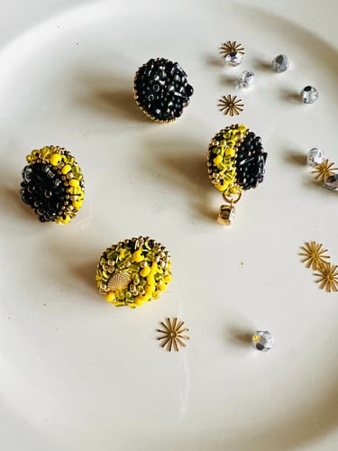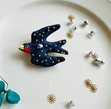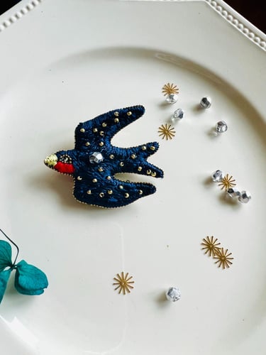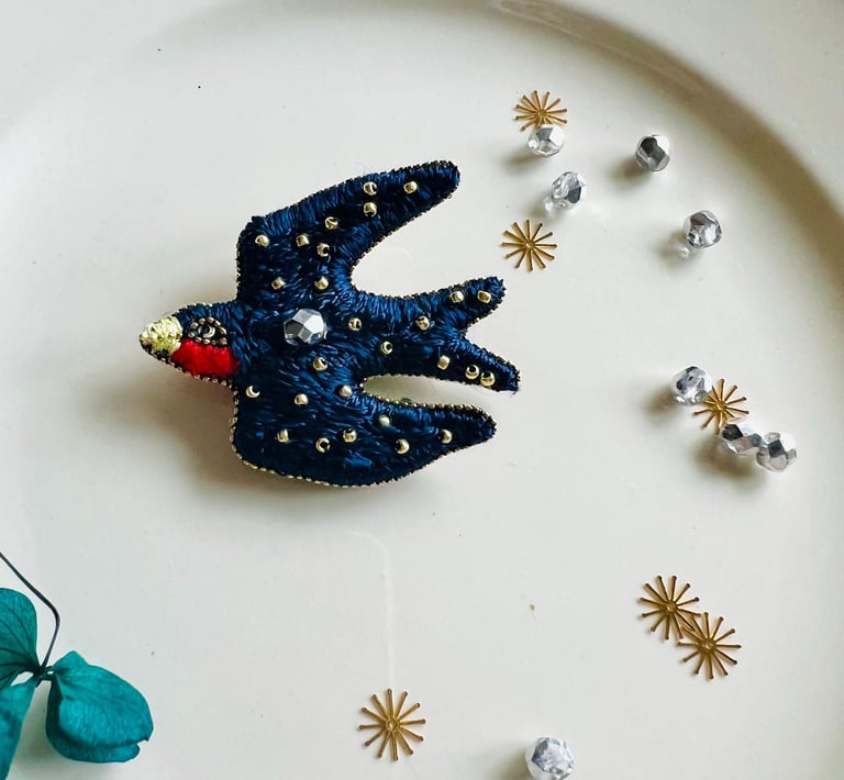 Création d’une broche brodée, richement ornée de perles et de paillettes. Pièces uniques, inspirées de l’univers poétique des contes de fées.